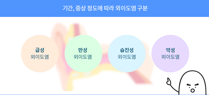 외이도염은 병에 걸린 기간, 증상 정도에 따라 ▶급성 외이도염 ▶만성 외이도염 ▶습진성 외이도염 ▶악성 외이도염으로 구분하며, 각각의 원인에 따라 치료제를 선택한다.